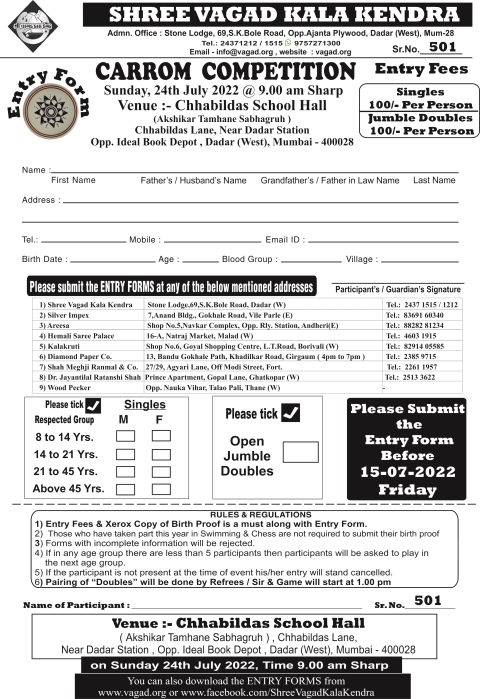 આ સ્પર્ધામાં ભાગ લેવા માટેના ફોર્મ સંસ્થાની ઓફીસ, રેગ્યુલર સેન્ટર, ફેસબુક, તેમજ વેબસાઈટઃ www.vagad.org ઉપરથી ફોર્મ મેળવી, વિગતવાર ભરી, બર્થ પ્રુફની ઝેરોકસ કોપી સાથે કોઈપણ એક સ્થળે મોકલાવી આપો. કોઈપણ સ્પર્ધક સીંગલ્સ અને ડબલ્સ આ બન્ને ગેમમાં ભાગ લઈ શકે છે. અને તે પ્રમાણે એન્ટ્રી ફી ભરવાની રહેશે.