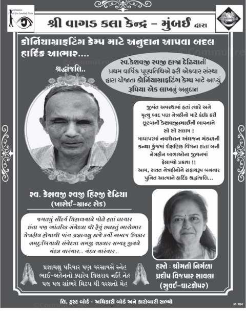 પ્રથમ વાર્ષિક પૂણ્યતિથી નિમિત્તે બીજી વખત કોર્નિયાગ્રાફટિંગ કેમ્પ કરાવવા માટે રૂપિયા એક લાખનું અનુદાન આપવા બદલ આભાર