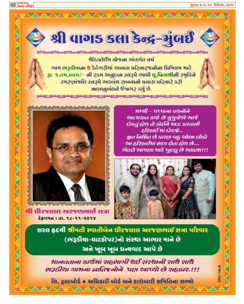 અંતર્ગત વર્ષ ગામ ભરૂડીયાના B કેટેગરીમાં આવતા પરિવારજનોના પ્રિમિયમ માટે રૂ. ૧,૦૫,૦૦૦/- ની રકમ અનુદાન સ્વરૂપે આપી પૂ. પિતાશ્રીની સ્મૃતિને સ્મરણાંજલિ સ્વરૂપે અકબંધ રાખવાનો પ્રયાસ પરિવારે કરી ૠણાનુબંધને ઉજાગર કર્યું છે.