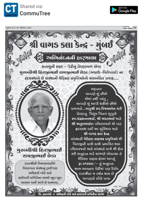 સતાયુની સફર - પેઢીનુ પ્રેરણાબળ એવા મુરબ્બીશ્રી હિરજીભાઈ રામજીભાઈ છેડા (ભચાઉ - વિલેપાર્લા) ના હ્દયસ્થાને છે સંસ્થા ની મેડિકલ પ્રવૃત્તિઓનો અસ્ખલિત પ્રવાહ....