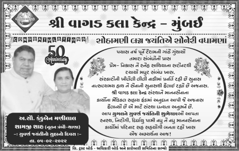 શ્રી વાગડ કલા કેન્દ્ર સંસ્થાને માનવસેવાના કાર્યોના મેડિકલ સહાય ફંડમાં અનુદાન આપી જે અજવાસ ફેલાવ્યો છે એ માટે સંસ્થા ધન્યતા અનુભવે છે. આપ યુગલને સુવર્ણ જયંતિની શુભેચ્છાઓ આપતા સ્વસ્થ, નિરોગી, દિર્ઘાયુ પામી વધુ ને વધુ માનવસેવાના કાર્યોમાં પરિવાર સહ સહયોગી બનતાં રહો ખાસ એજ અભ્યર્થના આજ!