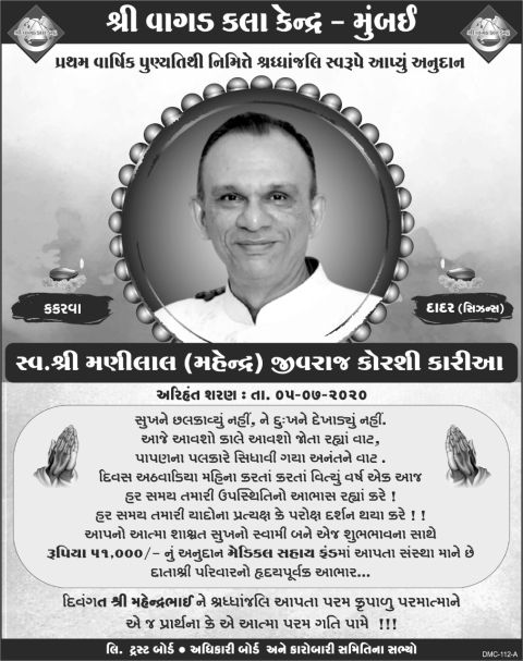 *પ્રથમ વાર્ષીક પુણ્યતિથિ* નિમિત્તે શ્રધ્ધાંજલિ સ્વરૂપે આપ્યું અનુદાન.