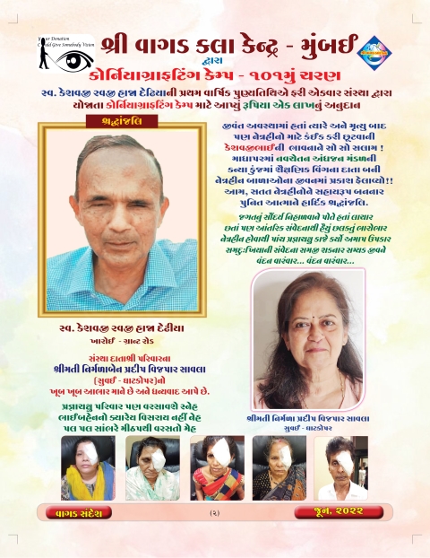 આમ, અન્ય પરિવારના જીવનને રંગીન બનાવવા કોર્નિયાગ્રાફટિંગ કેમ્પમાં રૂ. એક લાખનું અનુદાન સંસ્થાને આપવા બદ્દલ શ્રીમતી નિર્મળાબેન પ્રદીપ વિજપાર સાવલા (સુવઈ-ઘાટકોપર) પરિવાર ની સંસ્થા ભૂરિ ભૂરિ અનુમોદના કરે છે!