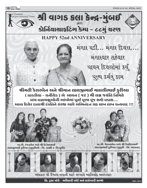 શ્રીમતી કેસરબેન અને શ્રીમાન લાલજીભાઈ માલસીભાઈ ફુરિયા (લાકડીયા - ચર્નીરોડ) એ બાવન (૫૨) મી લગ્ન જયંતિ નિમિત્તે પાંચ પ્રજ્ઞાયક્ષુઓની આંખોમાં પૂર્યાં પૂણ્ય પૂંજ શમો પ્રકાશ....