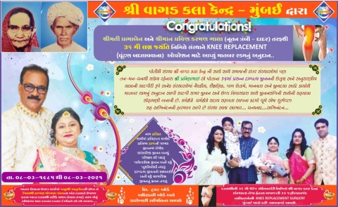 દાતાશ્રીની ૩૬ મી મેરેજ એનિવર્સરી નિમિત્તે શ્રી વાગડ કલા કેન્દ્ર સંસ્થાના નેજા હઠળ સમાજની ૩૬ જરૂરિયાતમંદ વ્યકિતઓની KNEE REPLACEMENT SURGERY મુંબઈ મધ્યે કરી આપવામાં આવશે.