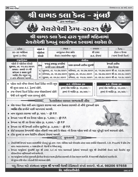 શ્રી વાગડ કલા કેન્દ્ર દ્વારા જુલાઈ મહિનામાં નેચરોપેથી કેમ્પનું આયોજન કરવામાં આવેલ છે.