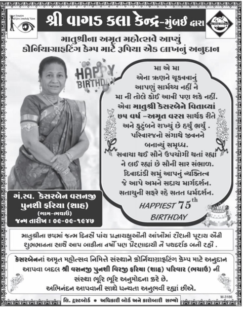માતુશ્રીના ૭૫માં જન્મદિવસે પાંચ પ્રજ્ઞાચક્ષુઓની આંખોમાં રોશની પૂરાય એવી શુભભાવના સાથે આપ બાકીના વર્ષો પણ પ્રેરણાદાયી ને પારદર્શક બની રહો.