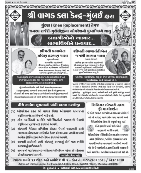 શ્રીમતી પ્રભાબેન પ્રવિણ કરમણ ગાલા (નૂતન ત્રંબો-દાદર) ના આર્થિક સહયોગથી શ્રીવાગડ કલા કેન્દ્ર-સંસ્થાના નેજા હેઠળ સમાજની ૩૬ જરૂરીયાતમંદ વ્યક્તિઓની Knee Replacement Surgery (TKR) ના ઓપરેશનનું રજીસ્ટ્રેશન ચાલુ જ છે...