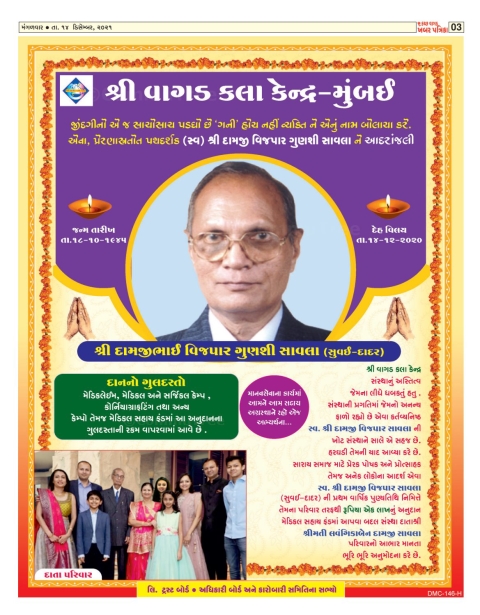 જીંદગીનો એ જ સાચોસારા પડધો છે' ગની ' હોય નહીં વ્યકિત ને એનું નામ બોલાયા કરે . એવા પ્રેરણાસ્ત્રતોત પથદર્શક (સ્વ) શ્રી દામજીભાઇ વિજપારભાઇ ગુણશીભાઇ સાવલા ને આદરાંજલી