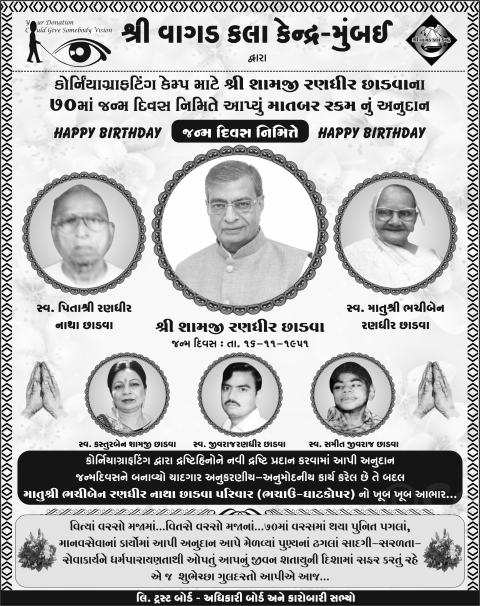 કોર્નિયાગ્રાફટિંગ કેમ્પ માટે શ્રી શામજી રણધીર છાડવાના ૭૦ માં જન્મ દિવસ નિમિતે આપ્યું માતબર રકમ નું અનુદાન