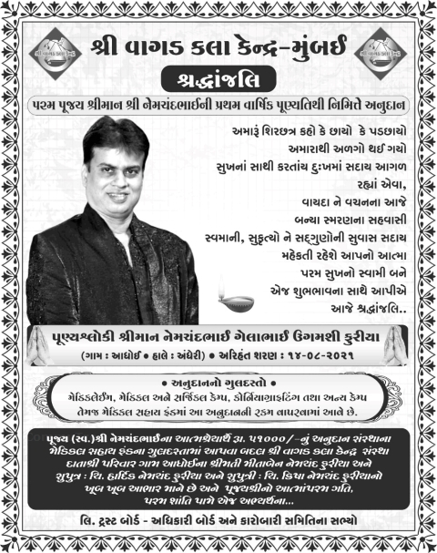 ગામઃઆધોઈ, હાલેઃઅંધેરી ના પૂણ્યશ્લોકી શ્રીમાન નેમચંદભાઈ ગેલાભાઈ ઉગમશી ફુરીયા