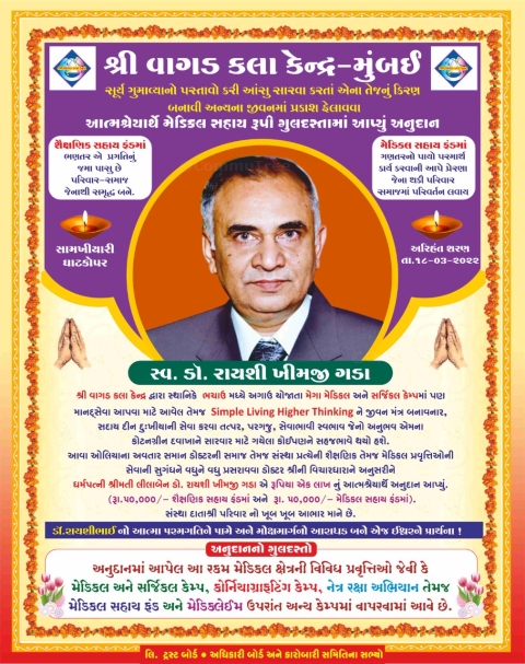 Simple Living Higher Thinking ને જીવન મંત્ર બનાવનાર, સદાય દીન દુઃખીયાની સેવા કરવા તત્પર, પરગજુ, સેવાભાવી સ્વભાવ જેનો અનુભવ એમના કોટન ગ્રીન દવાખાને સારવાર માટે ગયેલા કોઈપણને સહજભાવે થયો હશે. આવા ઓલિયાના અવતાર સમાન ડોકટરની સમાજ તેમજ સંસ્થા પ્રત્યેની શૈક્ષણિક તેમજ મેડિકલ પ્રવૃત્તિઓની સેવાની સુગંધને વધુ ને વધુ પ્રસરાવવા ડોક્ટર શ્રીની વિચારધારાને અનુસરીને ધર્મપત્ની શ્રીમતી લીલાબેન ડો.રાયશી ખીમજી ગડા એ રૂપિયા એક લાખ નું અનુદાન આપ્યું. (રૂ.૫૦,૦૦૦/- શૈક્ષણિક સહાય ફંડમાં અને રૂ.૫૦,૦૦૦/- મેડિકલ સહાય ફંડમાં) સંસ્થા દાતાશ્રી પરિવાર નો ખૂબ ખૂબ આભાર માને છે. તેમની આત્મા પરમગતિને પામે અને મોક્ષમાર્ગ નો આરાધક બને એજ ઈશ્વરને પ્રાર્થના !