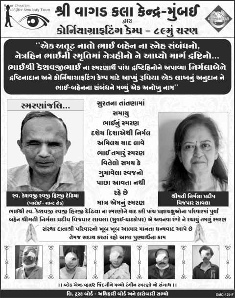 ભાઈશ્રી કેશવજીભાઈ ના સ્મરણાથેઁ પાંચ દ્રષ્ટિહિનોને અપાવ્યા નિર્મલાબેને દ્રષ્ટિના દાન અને કોનિઁયાગ્રાફટિંગ કેમ્પ માટે આપ્યું રૂપિયા એક લાખનું અનુદાન ને " ભાઈ બહેનના સંબંધને મળ્યું એક અનોખુ નામ "