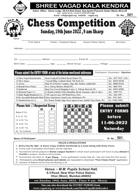 આ સ્પર્ધા માં ભાગ વેલા માટેના ફોર્મ સંસ્થાની ઓફિસ, રેગ્યુલર સેન્ટ, ફેસબુક તેમજ વેબસાઈટ www.vagad.org પરથી મળશે. ફોર્મ મેળવી વિગતવાર ભરી બર્થ પ્રૂફની ઝેરોક્ષ કોપી અને એન્ટ્રી ફી ના રૂ. ૧૦૦/- સાથે કોઈ પણ એક સ્થળે મોકલી આપવુ.