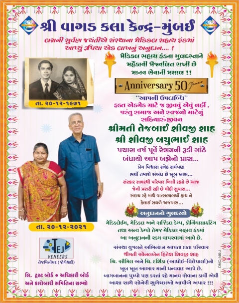 માતા પિતાની લગ્ન સુવર્ણં જયંતી એ સંસ્થાના મેડિકલ સહાય ફંડમાં આપ્યું રૂપિયા એક લાખનું અનુદાન