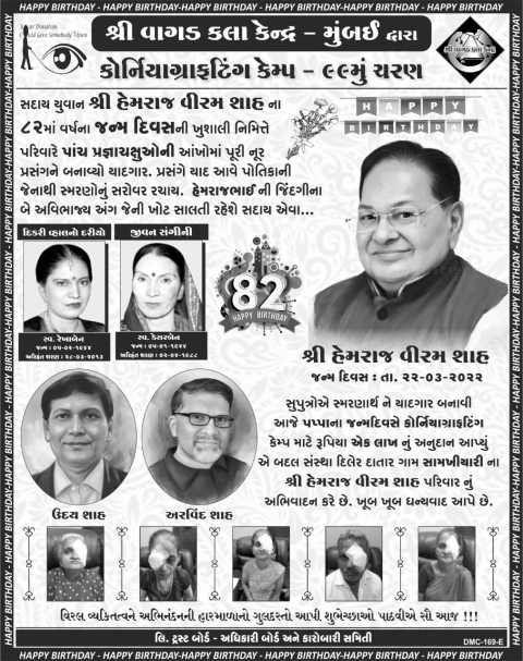 સદાય યુવાન શ્રી હેમરાજ વીરમ શાહના ૮૨ માં વર્ષના જન્મ દિવસની ખુશાલી નિમિત્તે પરિવારે પાંચ પ્રજ્ઞાચક્ષુઓની આંખોમાં પૂરી નૂર પ્રસંગને બનાવ્યો યાદગાર.