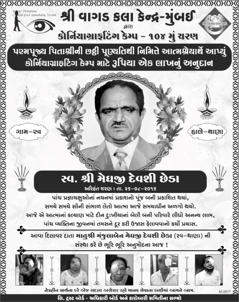 કોર્નિયાગ્રાફટિંગ કેમ્પ માટે આપ્યું માતબર રકમનું અનુદાન સ્વ. શ્રી મેઘજી દેવશી છેડા છઠ્ઠી પૂણ્યતિથી નિમિત્તે આત્મશ્રેયાર્થે આપ્યું કોર્નિયાગ્રાફટિંગ કેમ્પ માટે રૂપિયા એક લાખનું અનુદાન !