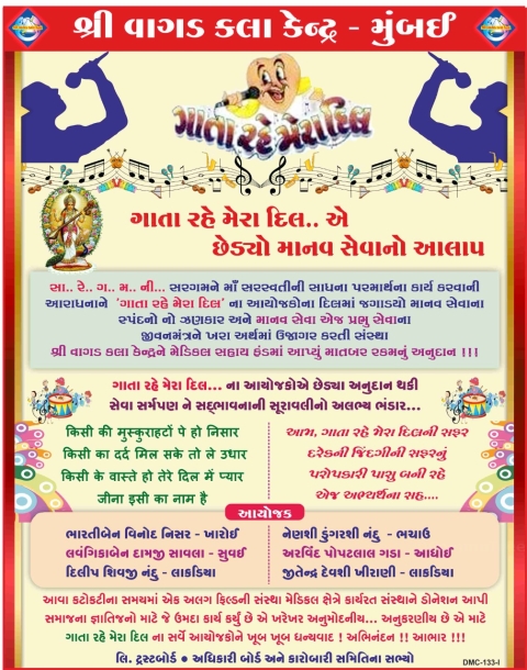 સા.. રે.. ગ.. મ.. ની... સરગમ ને માં સરસ્વતીની સાધના પરમાર્થંના કાર્યં કરવાની આરાધનાને ગાતા રહે મેરા દિલ ના આયોજકોના દિલમાં જગાડયો માનવ સેવાના સ્પંદનો નો ઝણકાર અને માનવ સેવા એજ પ્રભુ સેવાના જીવનમંત્રને ખરા અર્થમાં ઉજાગર કરતી સંસ્થા શ્રી વાગડ કલા કેન્દ્રને મેડિકલ સહાય ફંડમાં આપ્યું માતબર રકમનું અનુદાન !!!