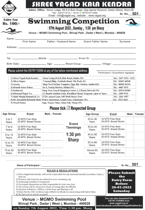 Please Submit the Entry Form before 30-July 2022, Saturday, with Entry Fee Rs.100/-