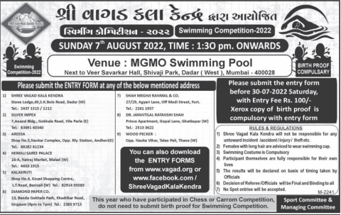 Venue: MGMO Swimming Pool, Next to Veer Savarkar Hall, Shivaji Park, Dadar (West), Mumbai - 400028